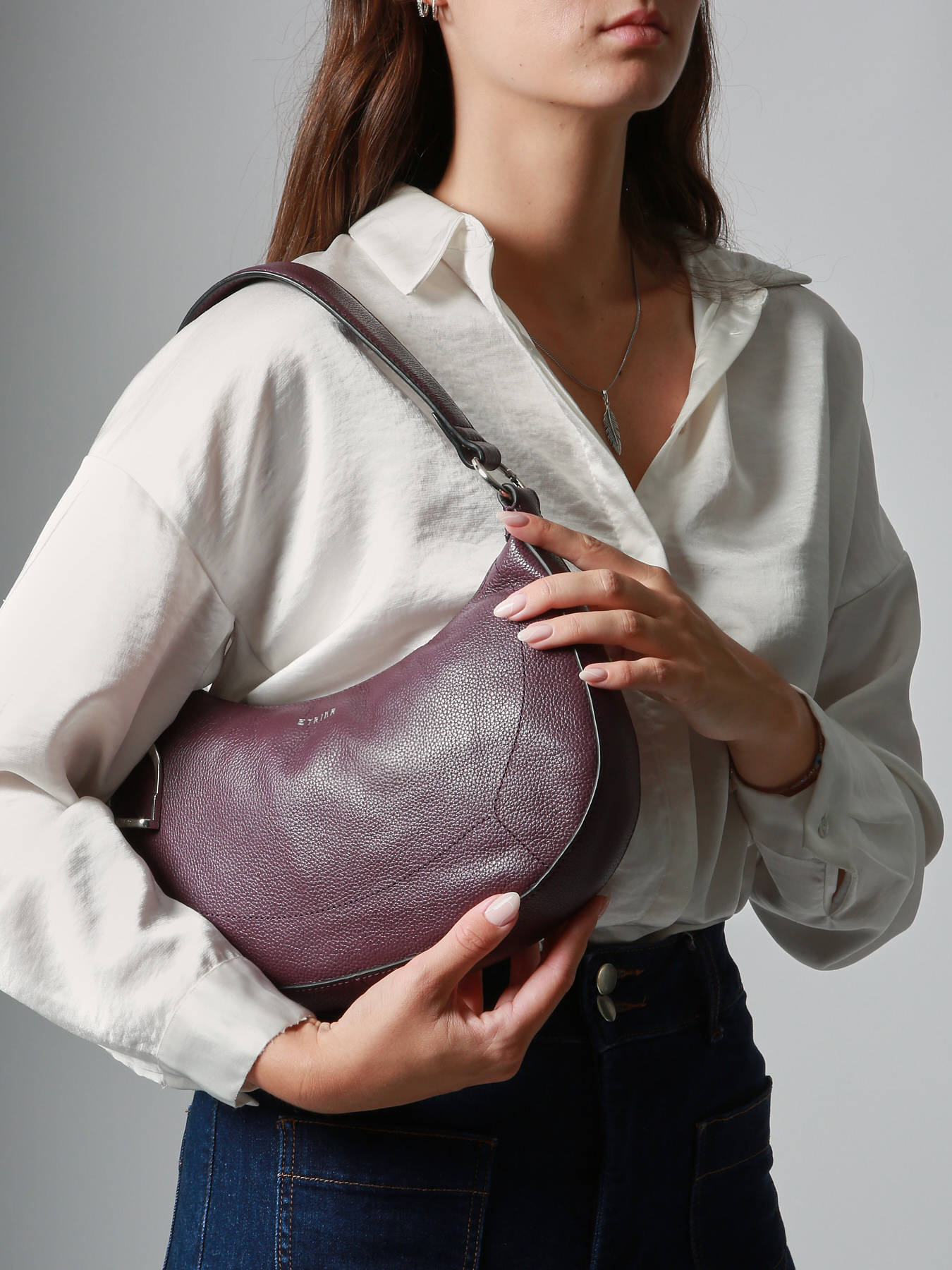 The ETRIER shoulder bag from the ALTESSE line features a half-moon silhouette, soft and modern. Crafted from high-quality grained cow leather, it closes easily with a zip closure. Equipped with a leather handle and an adjustable and removable woven shoulder strap, it offers versatility for shoulder or crossbody wear. Tone-on-tone stitching adds a touch of elegance. Inside, it has two simple pockets, a zip pocket, and a compartment for optimal organization of your belongings.