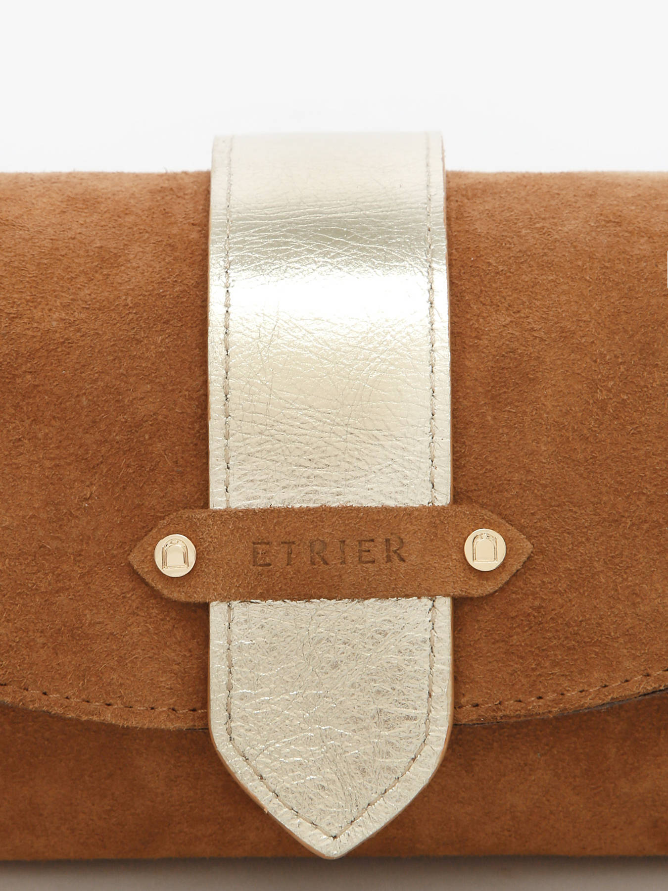 L'intérieur, entièrement doublé en cuir doré, comprend trois compartiments dont un central zippé, permettant d'organiser vos essentiels avec praticité et élégance. Le fond rigide assure un maintien optimal et une belle tenue au quotidien. Le logo ETRIER, embossé sur du cuir naturel, est accompagné d'un petit drapeau français, signature discrète du savoir-faire artisanal.